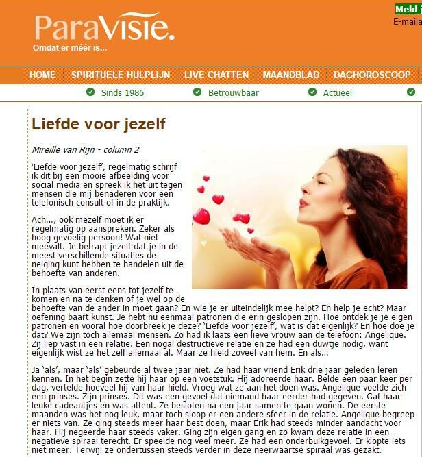 In plaats van eerst eens tot jezelf te komen en na te denken of je wel op de behoefte van de ander in moet gaan? En wie je er uiteindelijk mee helpt? En help je echt? Maar oefening baart kunst. Je hebt nu eenmaal patronen die erin geslopen zijn. Hoe ontdek je je eigen patronen en vooral hoe doorbreek je deze? ‘Liefde voor jezelf’, wat is dat eigenlijk? En hoe doe je dat? We zijn toch allemaal mensen. Zo had ik laats een lieve vrouw aan de telefoon: Angelique. Zij liep vast in een relatie. Een nogal destructieve relatie en ze had een duwtje nodig, want eigenlijk wist ze het zelf allemaal al. Maar ze hield zoveel van hem. En als…