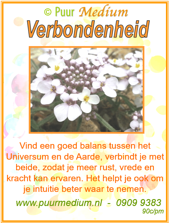 Puur Medium Orakelkaart 1: Verbondenheid:We zijn spirituele zielen met een aardse ervaring. Het komt vaak voor dat men zo vastklampt aan een van beide, zoals alleen maar gericht zijn op het aardse en afgesloten voor het spirituele of juist niet genoeg geaard te zijn. Om meer innerlijke rust te kunnen ervaren is het belangrijk om hier een goed balans voor jezelf in te kunnen vinden. Jij bent het middelpunt, Verbind je naar boven met het Universum, en via je voeten met de Aarde. Het kan ook zeker mogelijk zijn dat hierdoor je intuïtie wat helderder door kan komen. Vindt een fijn balans hierin en je zult gemakkelijker antwoorden en inzichten ontvangen.