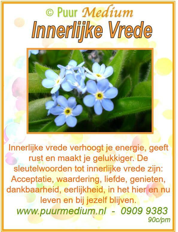 Puur Medium Orakelkaart 2: Innerlijke Vrede: Puur geluk komt van binnenuit. Al zijn we soms zo gericht op de situaties en invloeden van buitenaf dat we ‘vergeten’ om het geluk en de vrede in onszelf op te zoeken. We kunnen soms zo gefocust zijn op situaties die we zelf niet in de hand hebben. Hieronder een paar sleutelwoorden om nog meer naar je Eigen innerlijke vrede en geluk te keren: -Acceptatie: Wat is dat is. Wees blij met wie je bent, jij bent Uniek!- Genieten: Misschien heb je wel verlangens die niet in je bereik liggen, daar kun je naar toe werken, maar vergeet niet nu al te genieten van al het moois om je heen wat je al hebt, ook de kleine dingetjes.- Dankbaarheid: Wees elke dag dankbaar!- Leef in het hier en Nu: Er is niets te winnen bij het vasthouden aan teleurstellingen uit het verleden.- Omring jezelf altijd met liefde, ook de liefde in jezelf.