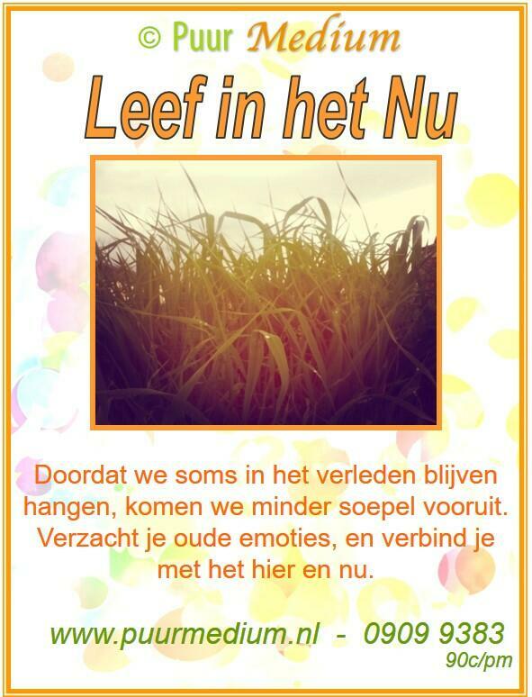 Puur Medium Orakelkaart 2. Leef in het Nu: Er is weinig te winnen bij het vasthouden aan teleurstellingen uit het verleden.Het is vaak moeilijk om situaties uit het verleden los te laten of een plekje te geven. Omarm je oude emoties vol liefde, accepteer, zodat de scherpe randjes eraf gaan. Houdt uiteindelijk een herinnering over zonder dat er sterke emoties aan vast zitten. Leer wat je lessen zijn geweest. Breng jezelf in balans door in het hier en nu te leven, en voel dat je daardoor ook sterker in je eigen energie komt te staan en ook gerichter keuzes kunt maken.