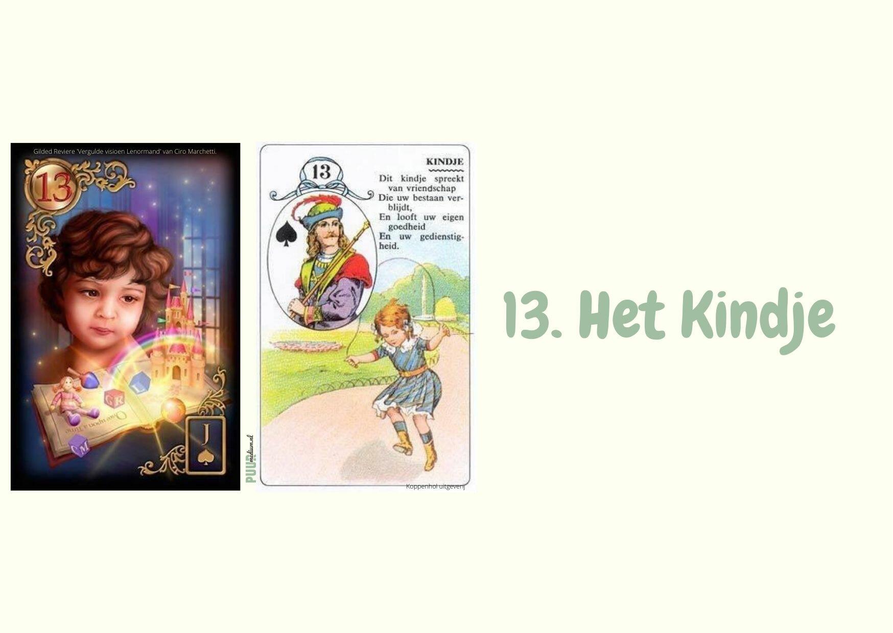 Uitleg Lenormandkaart: 13. Het Kind: Het kind is een van de letterlijke ‘mensen-kaarten’in de lenormand-methode, die een jong persoon aanduidt. We gebruiken deze kaart ook als symbool die op een jong persoon wijst.