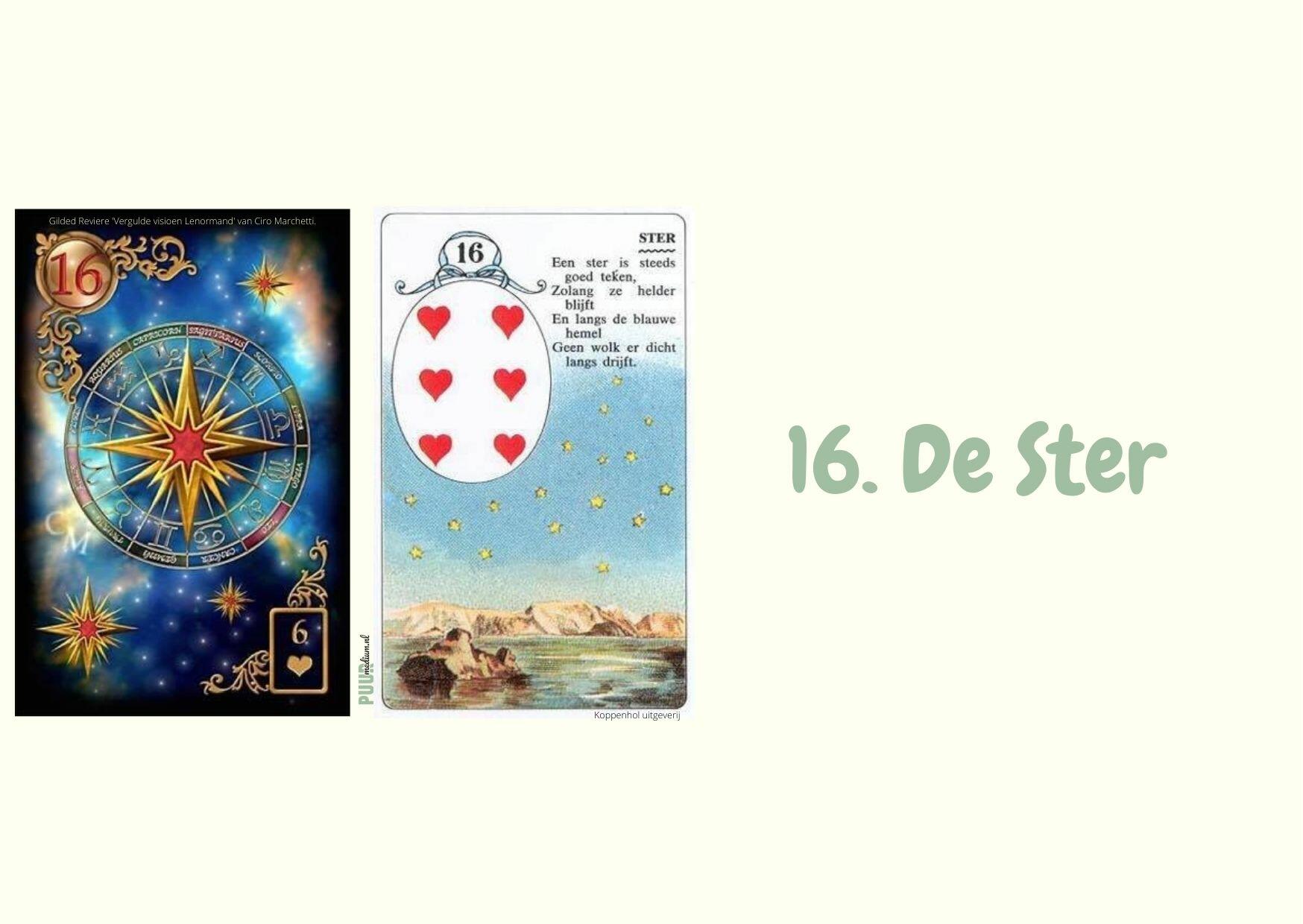 Uitleg Lenormandkaart: 16. De Sterren: De Ster is volgens het oud Hollandse versje een goed teken, dus een gelukskaart. Bij deze kaart kun je denken aan wensen die in vervulling gaan, een goede afloop, dromen die uitkomen, meevallers, hoop, nieuwe doelen, maatschappelijk succes, roem. En de bijbehorende positieve emoties zoals: vreugde, blijdschap en optimisme. Denk bij deze kaart ook aan eigenschappen die tot succes leiden zoals: vertrouwen, motivatie, vertrouwen, uitstraling. De sterren die aan de hemel staan kun je associëren met het universum, inspiratie, visie, inspiratie, de hogere waarheid, inzichten, het astrale, verlichting, meditatie en hogere chakra’s en natuurlijk gesternte, astrologie, astronomie, luchtvaart.