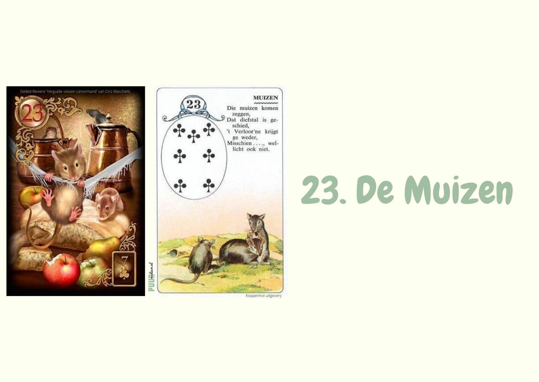 Uitleg Lenormandkaart: 23. De Muizen: Muizen verwijzen naar diefstal, maar het versje op de lenormandkaart vermeldt ook dat het verlorene mogelijk terugkeert. Deze kaart heeft te maken met tekorten, diefstal, ondermijning, en (klein) verliezen. Niet is dit alleen alleen op financieel gebied, maar bijvoorbeeld geestelijk, lichamelijk of in relaties. Maar zoals het versje aangeeft, vaak tijdelijk, een weerzien en of herstel vindt plaats na een periode van gemis (kijk vooral ook goed naar de omliggende kaarten om hier meer duidelijkheid over te krijgen). Het woord muizenissen brengt je ook bij piekeren, zorgen, teleurstellingen. Muizen worden vooral gezien als een ongedierte, ongedierte die dus overlast veroorzaakt, een plaag, een infectie en een onuitroeibaar iets. Tegelijk kan het ook om grote vermeerdering gaan, expansie, toevloed, denk maar aan de vele nakomelingen die muizen hebben.