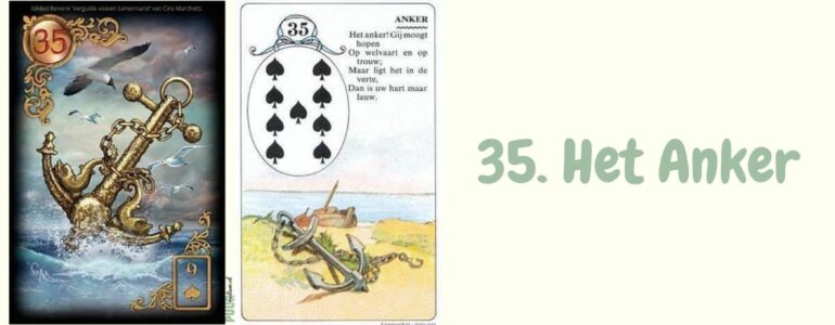 Uitleg Lenormandkaart: 35. Het Anker: Het Anker heeft volgens het versje met welvaart en trouw te maken. Jouw anker vinden verwijst naar stabiliteit, betrouwbaarheid, regelmaat, houvast, verankeren, gronden, structuur, aanhoudend. Daarom verwijst deze kaart ook naar de verankering in vastigheid en continuïteit in relaties, werk, beroep en in privéleven. Het verwijst naar welvaart en een zekere thuishaven. Bij overmaat hiervan kan het juist verwijzen naar dat wat met gehechtheid en vastzitten te maken heeft . Op het gebied van liefde is er zekerheid en trouw.