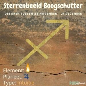 Sterrenbeeld Boogschutter- Eigenschappen en Karakter: Het teken Boogschutter is ideologisch en filosofisch ingesteld. Het uitdragen van geestelijke waarden kan met veel vuur en enthousiasme worden gedaan. Boogschutter richt zich graag op de grotere verbanden. De Boogschutter ziet daarbij soms wel eens de feiten over het hoofd. Avontuur en nieuwe plannen wil Boogschutter graag aangaan. Nieuwe impulsen kunnen er vaak niet genoeg zijn. Waardoor de Boogschutter vooral rusteloos maar ook ongeduldig kan overkomen. De Boogschutter is zoekend naar de samenhangen en de verbanden in alles wat die tegenkomt in het leven.