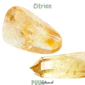 Citrien: is een edelsteen met een geel of oranjebruine kleur. De steen behoort tot de macrokristal lijnen kwarts familie. Door Amethist en Rookkwarts te verhitten maakt men Citrien na .Deze variant werkt minder goed dan de natuurlijke variant. De steen heeft als werking een zonnige, krachtige steen te zijn die bij de sterrenbeelden Tweelingen en Leeuw en het Zonnevlecht chakra hoort.