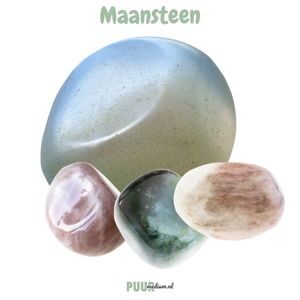 Maansteen: is een edelsteen die sterk verbonden is met de maan en intuïtie. Evenals de maan is de steen weerkaatsend en herinnert hij ons eraan dat alles deel uitmaakt van een cyclus van verandering zoals ook de maan wast (toeneemt) en afneemt. Zijn krachtigste effect is het kalmeren van emoties. Fysiek heeft Maansteen invloed op de vrouwelijke voortplantingscyclus en verlicht menstruatieklachten en spanning. Zijn verbinding met de pijnappelklier zorgt voor evenwicht in het hormonale stelsel en stabiliseert de balans van vloeistoffen. De steen biedt hulp bij shock en is nuttig voor hyperactieve kinderen. Maansteen is vol ontvankelijke, passieve, vrouwelijke energie. Het brengt mannelijke en vrouwelijke energieën met elkaar in evenwicht en helpt mannen die in contact met hun vrouwelijke kant willen komen.